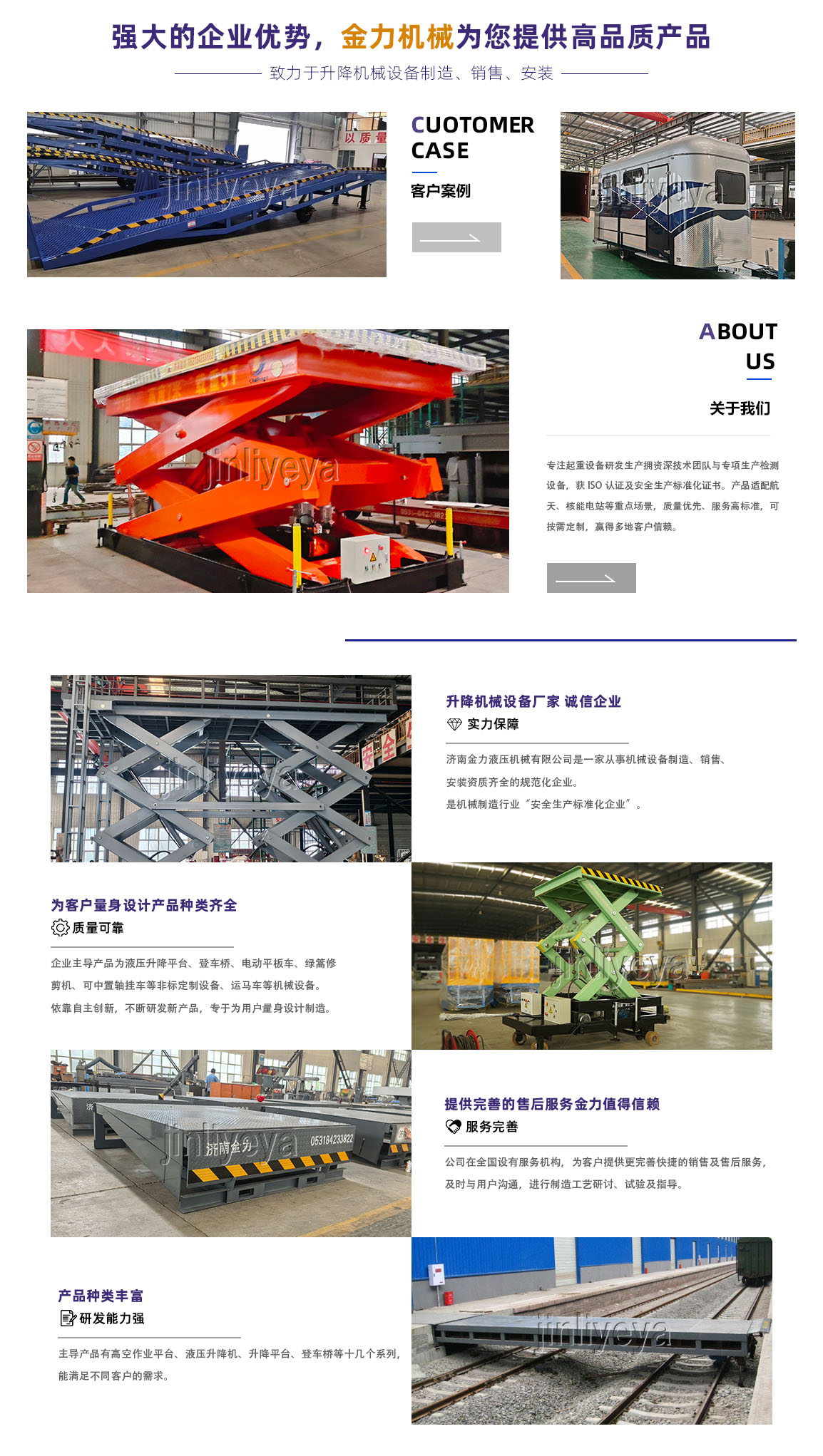 济南金力液压机械有限公司是质量、信誉双保单位,重合同守信用单位。工厂始建于1958年,于2004年改制,占地面积12万平方米,建筑面积8万平方米,本公司生产设备精良,工艺,检测手段齐全,技术力量丰富,是国内液压升降平台生产厂家。 本公司已通过了ISO国际质量管理体系认证,获得国家安全生产标准化证书。液压升降平台生产设备精良,检测工具齐全,具有较强生产能力,不断研发新产品,坚持诚信为本 、信誉至上的信念和优zhi的服务标准赢得了...